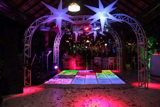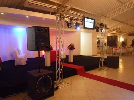* ESTRUTURA MÉDIA: COM 3 CAIXAS DE SOM E 2 TORRES DE TRELIÇA COM 7 PEÇAS DE ILUMINAÇÃO E TAPETE QUADRICULADO, (SUPORTA ATÉ 100 CONVIDADOS EM LUGAR FECHADO).