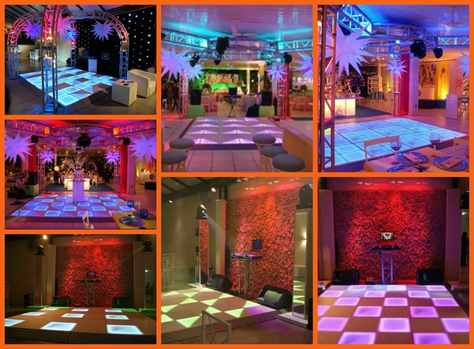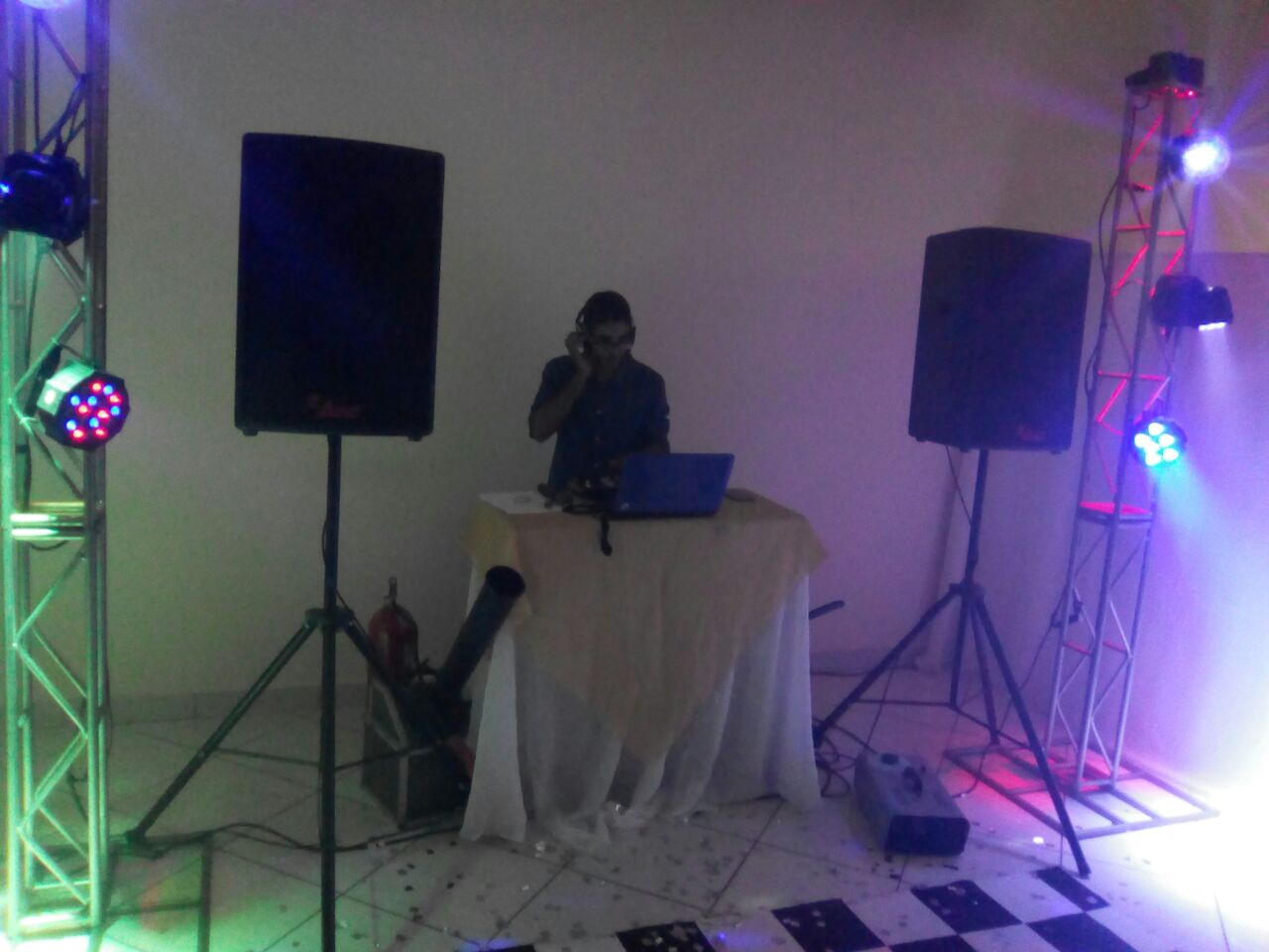 * ESTRUTURA PEQUENA: COM 2 CAIXAS DE SOM E 5 PEÇAS DE ILUMINAÇÃO E TAPETE QUADRICULADO, (SUPORTA ATÉ 60 CONVIDADOS EM LUGAR FECHADO)