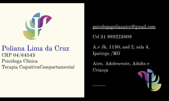 Sou Psicóloga formada pela faculdade Pitágoras, estou cursando Pós graduação em Terapia Cognitiva Comportamental,( Pitágoras -junho/2020); Psicopedagogia, (Faveni -junho 2020); Neuropsicologia com Problemas de aprendizagem (Faveni -*information hidden*e ,AEE - Atendimento Educacional Especializado (Faveni, - junho/*information hidden*trabalho no Centro Médico Veneza em Ipatinga e na Harmonia do Corpo em Timóteo e Fabriciano melhores informações 31 *information hidden*